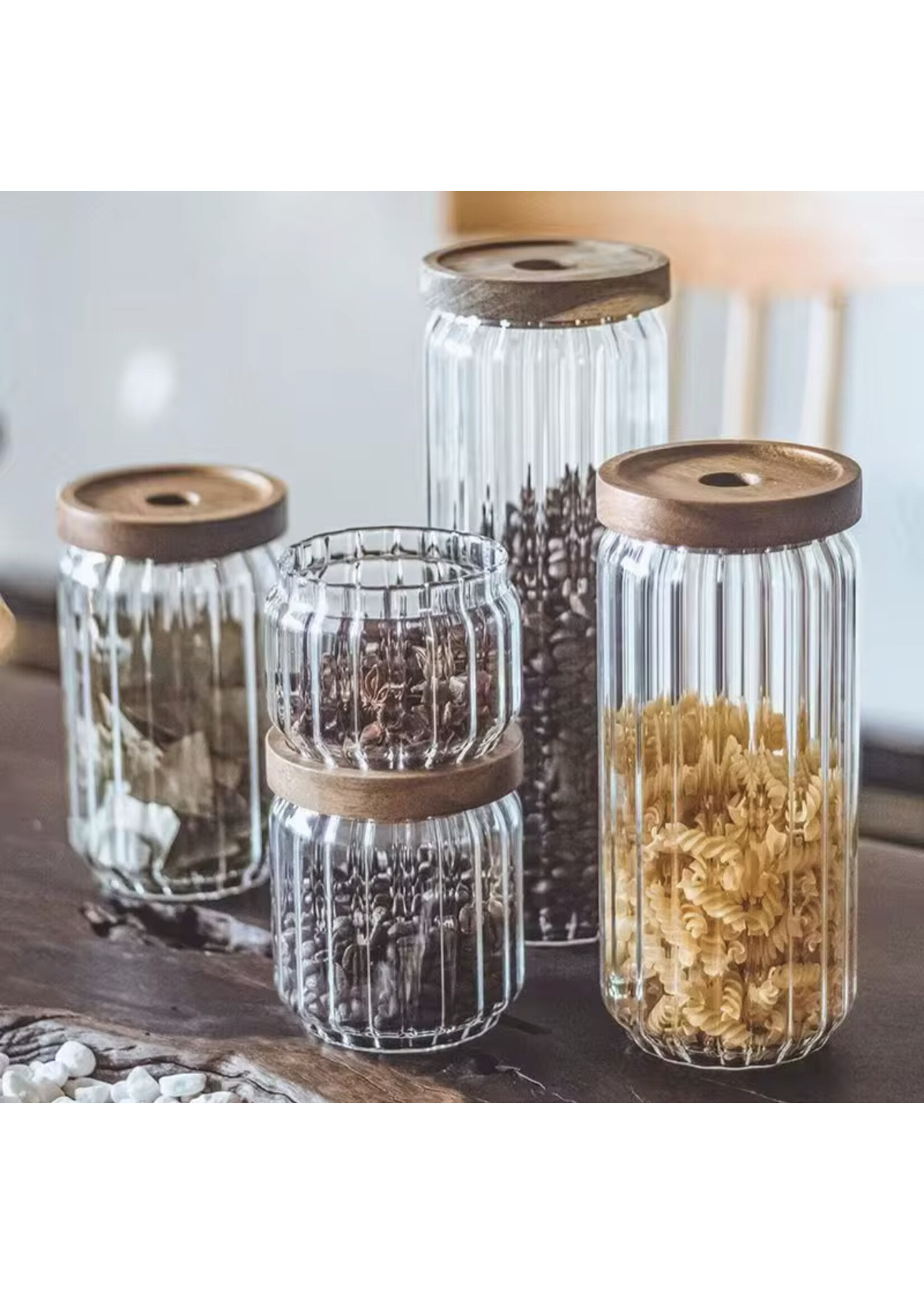 Voorraadpot ribbel met acacia houten deksel 1000cc